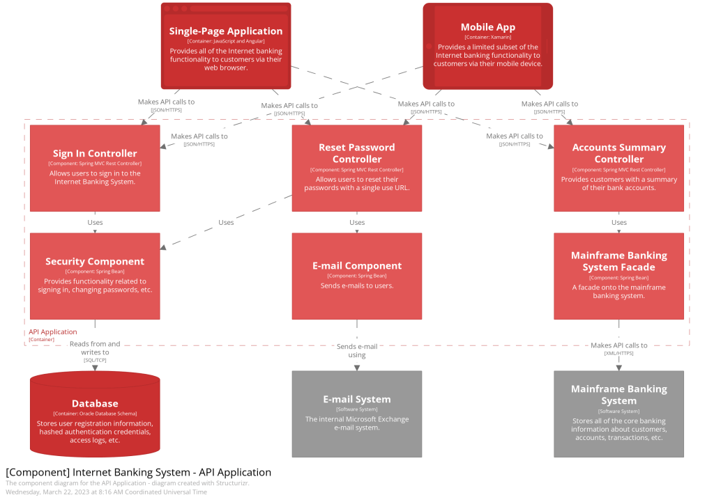 Example Application: Inside the API container of our banking system app, a Component Diagram would show components like the controllers, repositories that interact with the database, email components that interact with the email system, or the facade that abstracts the legacy mainframe system.